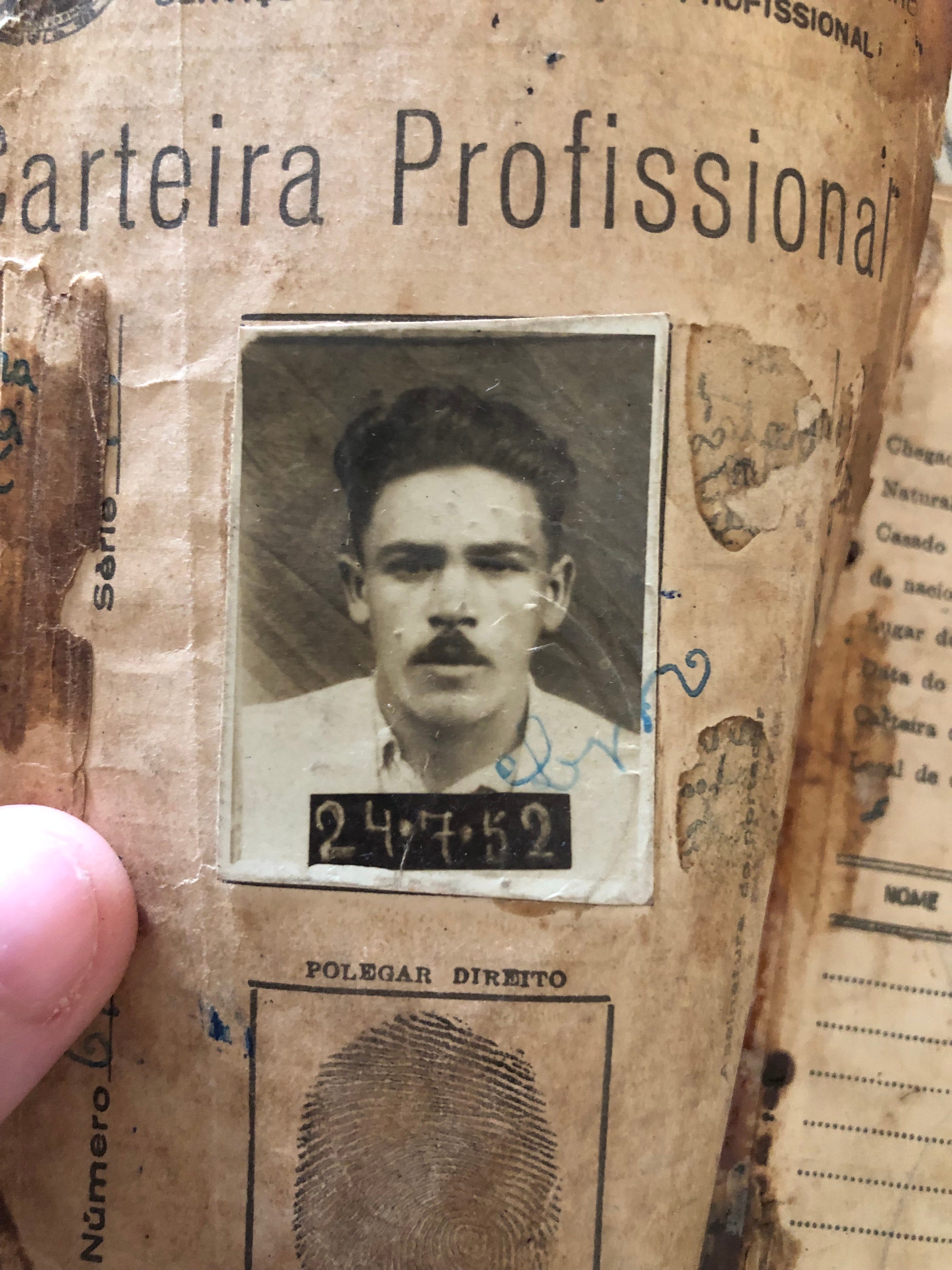 foto de sua carteira de trabalho, em 1952.